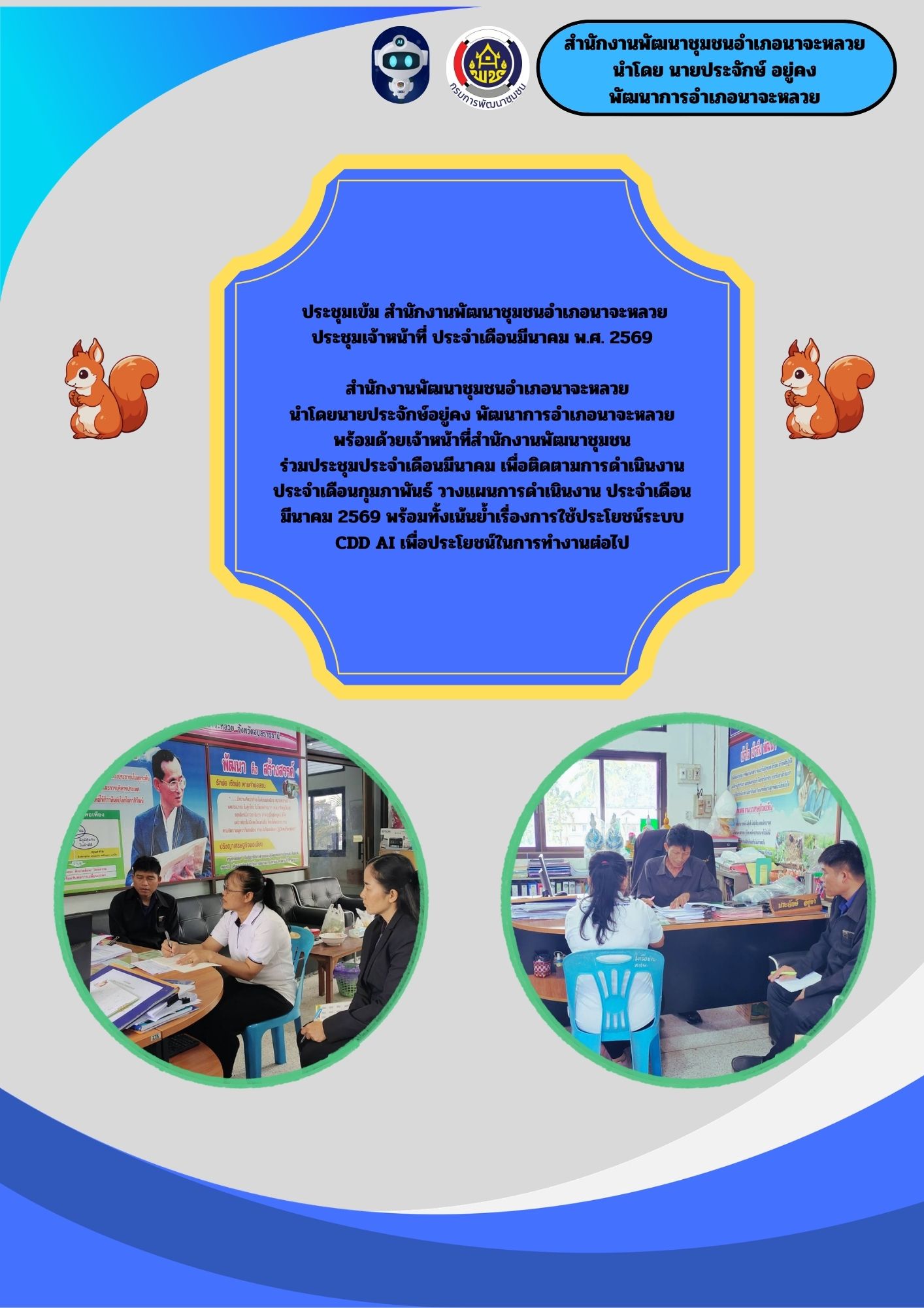 สำนักงานพัฒนาชุมชนอำเภอนาจะหลวย นำโดยนายประจักษ์ อยู่คง พัฒนาการอำเภอนาจะหลวย พร้อมด้วยเจ้าหน้าที่สำนักงานพัฒนาชุมชน ร่วมประชุมประจำเดือนมีนาคม เพื่อติดตามการดำเนินงานและวางแผนการดำเนินงาน ประจำเดือนมีนาคม 2569 ในาการนี้ได้เน้นย้ำเรื่องการใช้ข้อมูล ในระบบCDD AI เพื่อการทำงานที่รวดเร็ว และแม่นยำยิ่งขึ้น