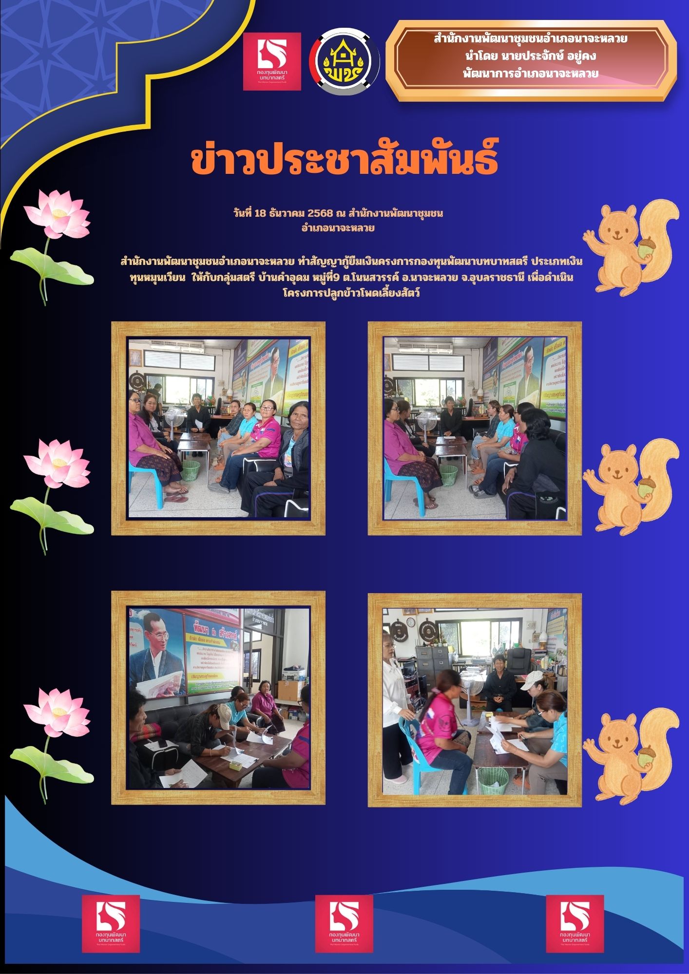 วันที่ 18 ธันวาคม 2568 ณ สำนักงานพัฒนาชุมชนอำเภอนาจะหลวย นายประจักษ์ อยู่คง พัฒนาการอำเภอนาจะหลวย พร้อมด้วย นางจันทร์จิรา บัวสุทธิกุล นักวิชาการพัฒนาชุมชนชำนาญการ เจ้าหน้าที่ผู้รับผิดชอบงานกองทุนพัฒนาบทบาทสตรี ได้ดำเนินการทำสัญญากู้ยืมเงินโครงการกองทุนพัฒนาบทบาทสตรี ประเภทเงินทุนหมุนเวียน ให้กับกลุ่มสตรี บ้านคำอุดม หมู่ที่9 ต.โนนสวรรค์ อ.นาจะหลวย จ.อุบลราชธานี เพื่อดำเนินโครงการปลูกข้าวโพดเลี้ยงสัตว์ โดยสมาชิกกลุ่มทุกคน ได้ร่วมทำสัญญาและรับทราบถึงแนวทางการดำเนินโครงการต่อไป