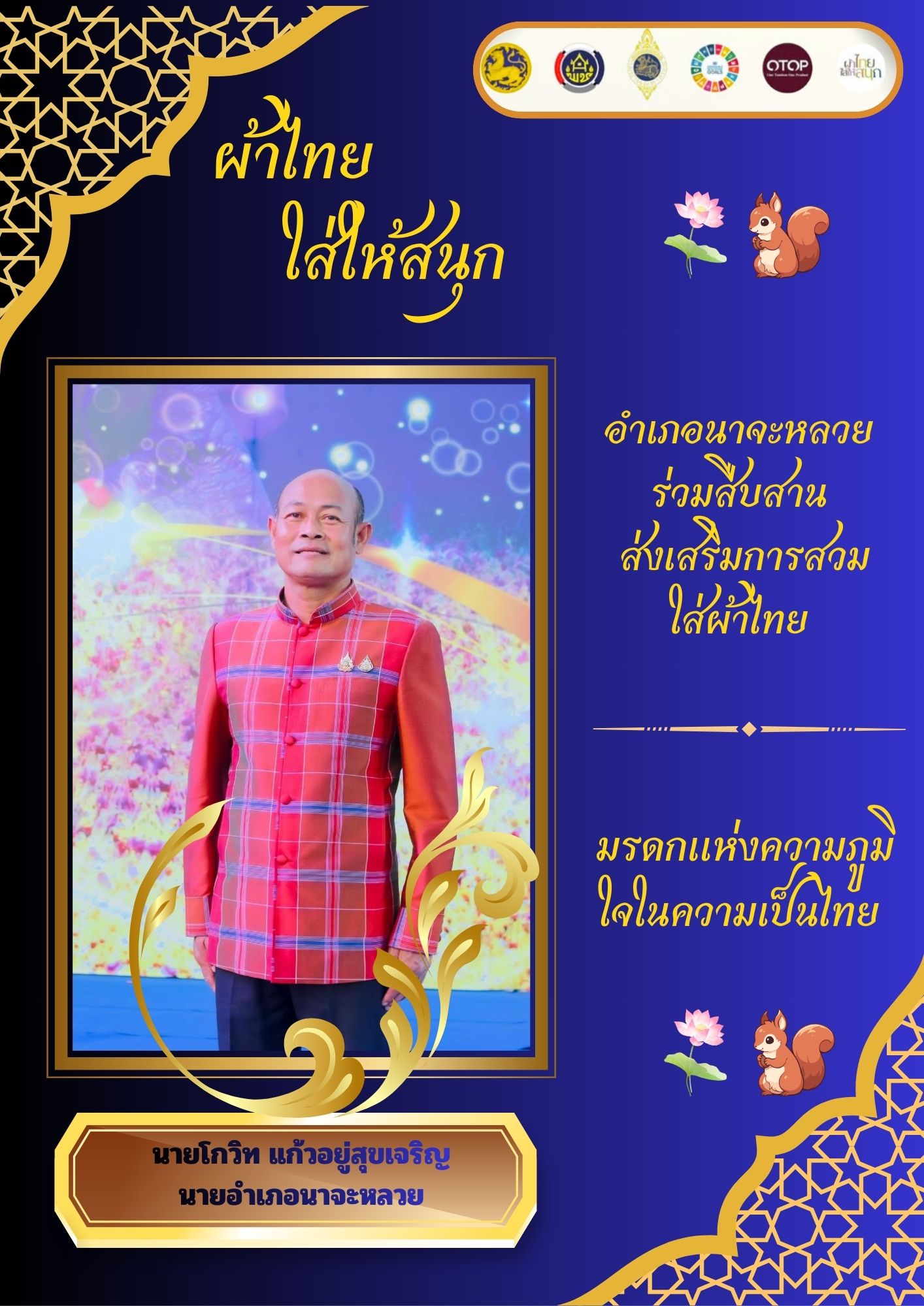 ภายใต้การนำของ นายโกวิท แก้วสุขอยู่เจริญ นายอำเภอนาจะหลวย พร้อมด้วยส่วนราชการ และกลุ่มองค์กรภาคีเครือข่าย ขอเชิญชวนพี่น้องประชาชนทุกท่านร่วมแต่งกายด้วยชุดไทยพระราชนิยม เพื่อเป็นการสืบสานมรดกแห่งความภาคภูมิใจในความเป็นไทย และน้อมรำลึกในพระมหากรุณาธิคุณอันหาที่สุดมิได้ของสมเด็จพระนางเจ้าสิริกิติ์ พระบรมราชินีนาถ พระบรมราชชนนีพันปีหลวง ที่ทรงมีต่อการอนุรักษ์และส่งเสริมผ้าไทย