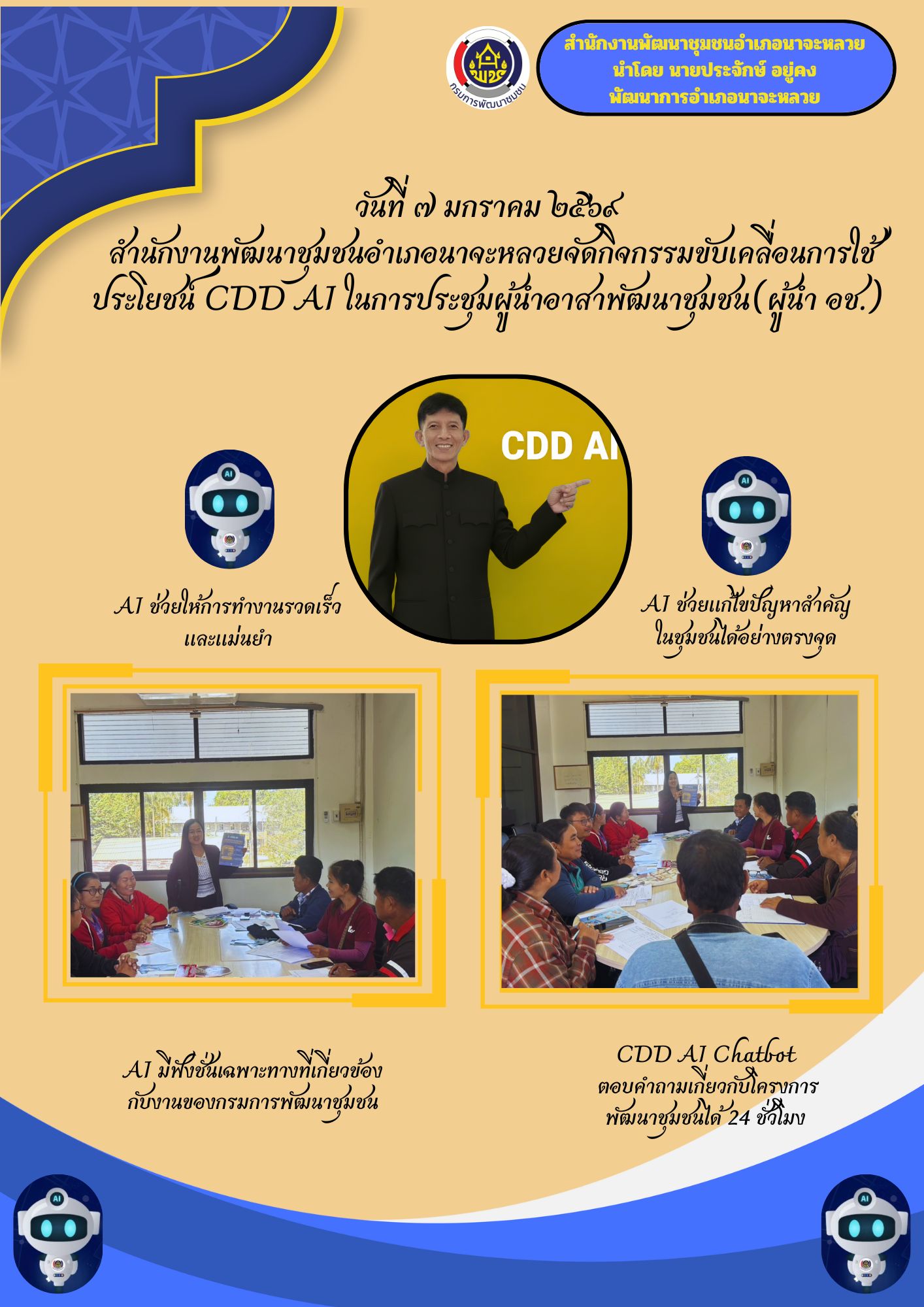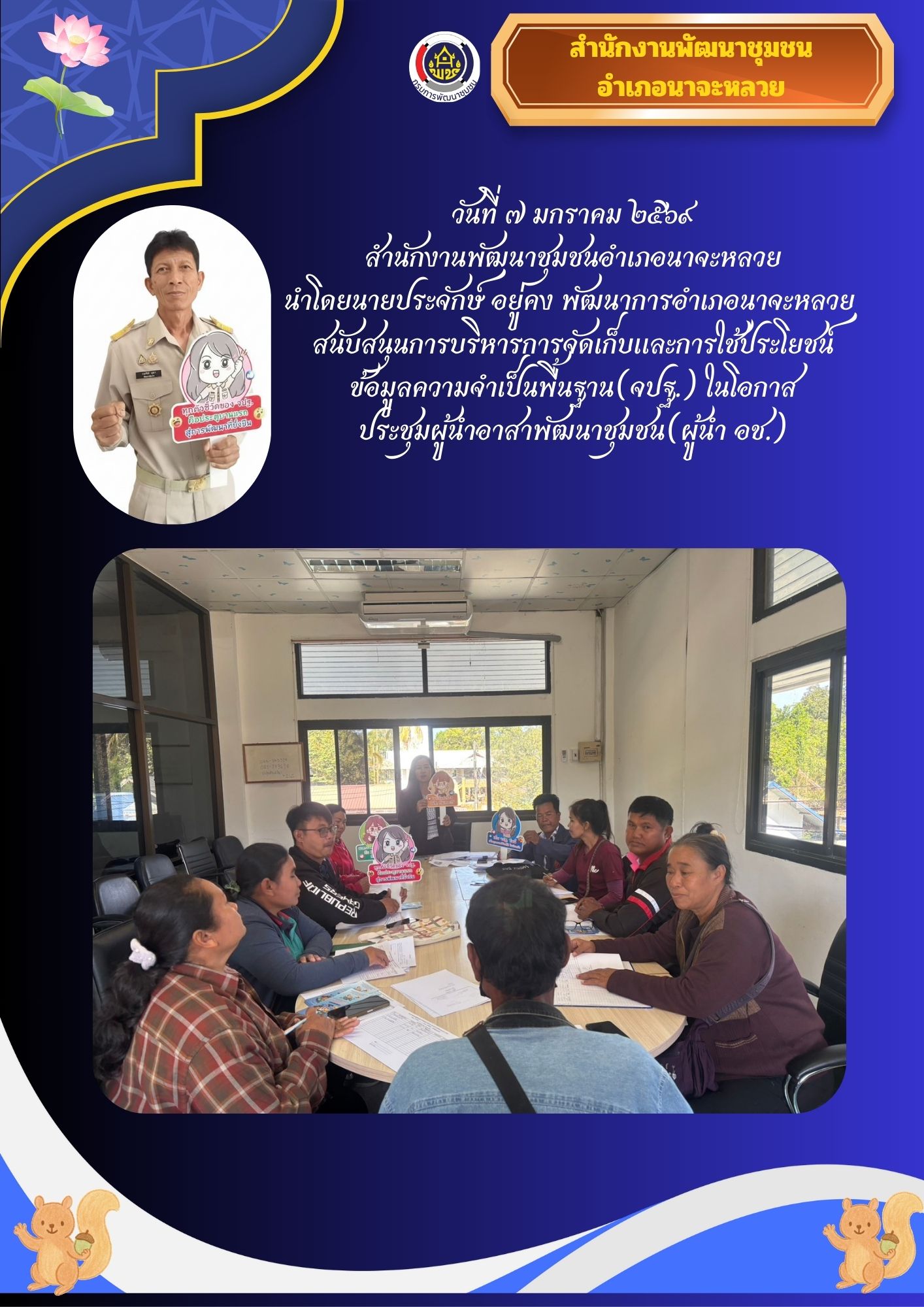 วันที่ 7 มกราคม 2569 เวลา 09.00น. นายประจักษ์ อยู่คง พัฒนาการอำเภอนาจะหลวย มอบหมายให้นางสาวนิชรมัย พาหุนัน อาสาพัฒนา ดำเนินการประชุมผู้นำอาสาพัฒนาชุมชน(ผู้นำ อช.) ประจำไตรมาส 1 เพื่อกำหนดแผนการปฏิบัติงานประจำไตรมาส 2 ในปีงบประมาณ 2569 และจัดทำเอกสารประกอบการเบิกจ่ายค่าตอบแทนผู้นำอาสาพัฒนาชุมชน(ผู้นำ อช.) สำหรับไตรมาสที่ 1 การประชุมในครั้งนี้ได้มีการเสริมในเรื่องของกิจกรรมขับเคลื่อนการใช้ประโยชน์ CDD AI เพื่อให้ผู้นำอช. ได้ทราบถึงประโยชน์ในการใช้งานระบบ เพื่อพัฒนาชุมชน นอกจากนี้ยังมีการสนับสนุนการบริหารการจัดเก็บและการใช้ประโยชน์ข้อมูลความจำเป็นพื้นฐาน(จปฐ.) โดยการตระหนักให้ผู้นำอาสาพัฒนาชุมชนทราบถึงบทบาทหน้าที่ ที่เกี่ยวข้องกับการให้การสนับสนุนข้อมูลที่ถูกต้อง